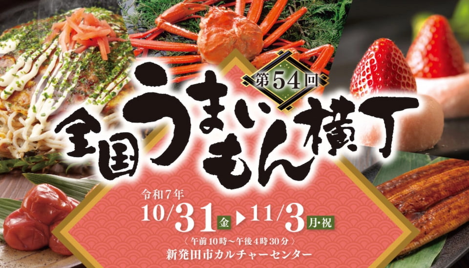 秋の新発田の恒例イベント「全国うまいもん横丁」が、今年も新発田市カルチャーセンターで開催されます! 全国各地の美味しいもの、匠の技が光る逸品が勢ぞろい。